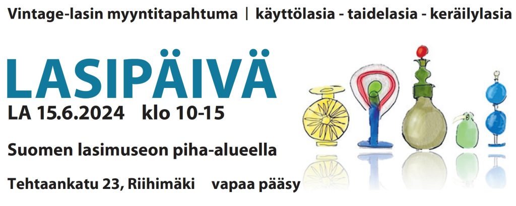 Suurta suosiota kerännyt Lasipäivä tulee taas! Suomen lasimuseon ystävät tuovat yhden päivän ajaksi myyntiin kattavan valikoiman käyttölasia, taidelasia ja keräilylasia Suomen lasimuseon piha-alueelle. Perinteiseen tapahtumaamme saapuu vuosittain yli 100 myyjää ja vilkkaasti kävijöitä.